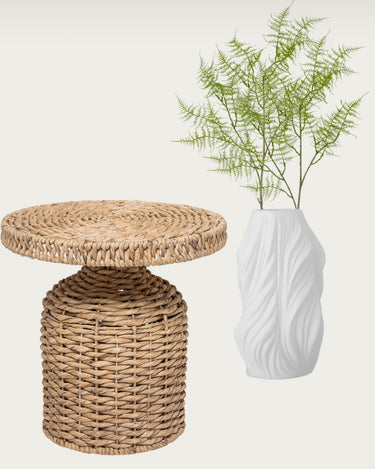 Add a touch of organic charm to your home with this beautifully woven water hyacinth side table. Perfect as a standalone accent piece adorned with flowers and decorative items, or as a practical companion next to your sofa. The sturdy woven base, handcrafted from natural water hyacinth, provides excellent stability while maintaining an airy, natural aesthetic that enhances any cozy living space.