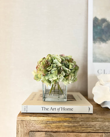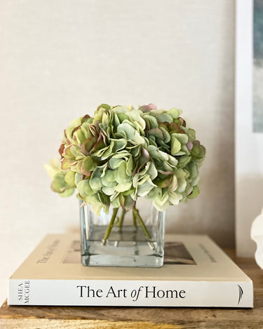 FAUX HYDRANGEA ARRANGEMENT IN CUBED GLASS (GREEN)