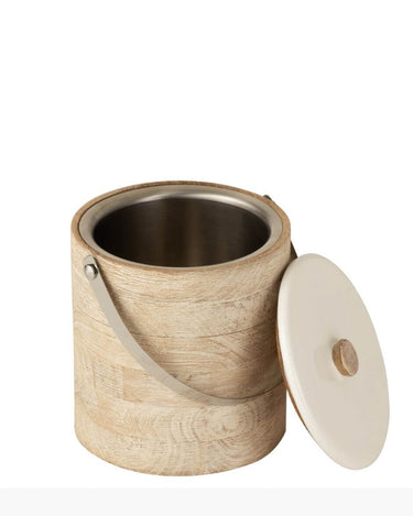 Ice bucket in mango wood with white ceramic lid on white background Ice bucket in mango wood with white ceramic lid on white background