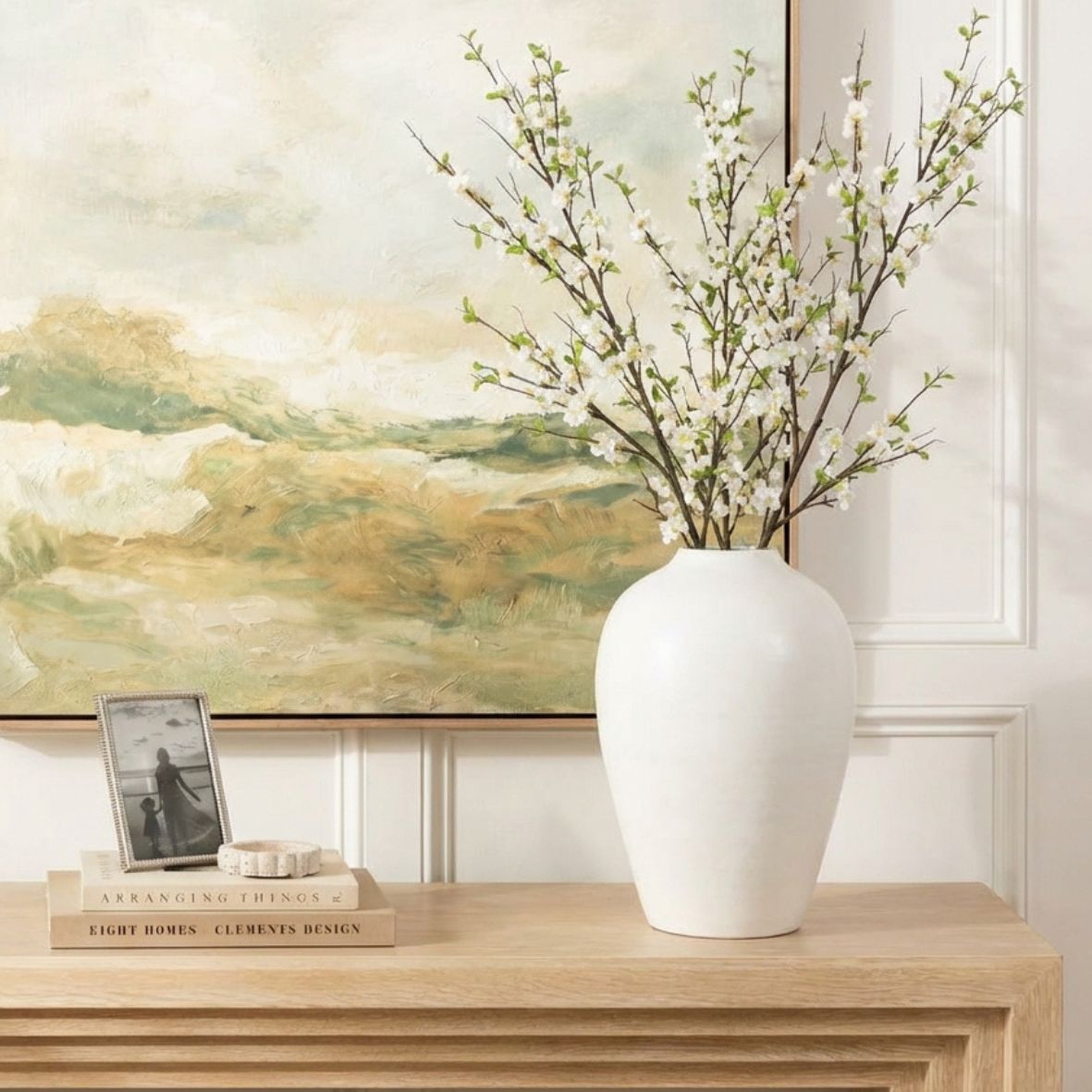Tuck a few stems into a simple ceramic vase on a console table and watch how they soften the entire space. Arrange them in a glass vessel on your kitchen island for a touch of effortless spring, or layer them into a fuller arrangement to add height and movement. The crisp white blossoms catch the light beautifully, while the subtle green centres keep the look feeling natural and fresh.