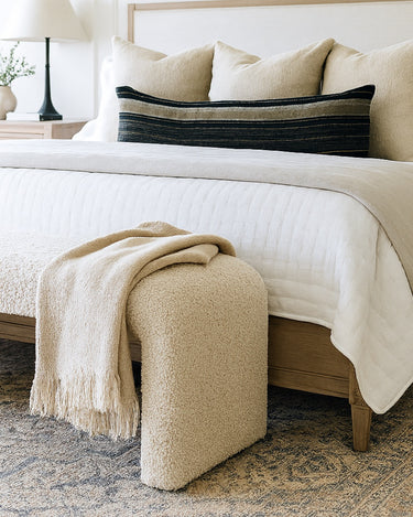 The Bobbie Bench is an organically shaped bench in light bouclé fabric. The bench is highly decorative on its own but can also be styled with cushions and throws or other decorative elements. No matter how you choose to use it, the Bobbie Bench will be a beautiful and functional addition to the home.