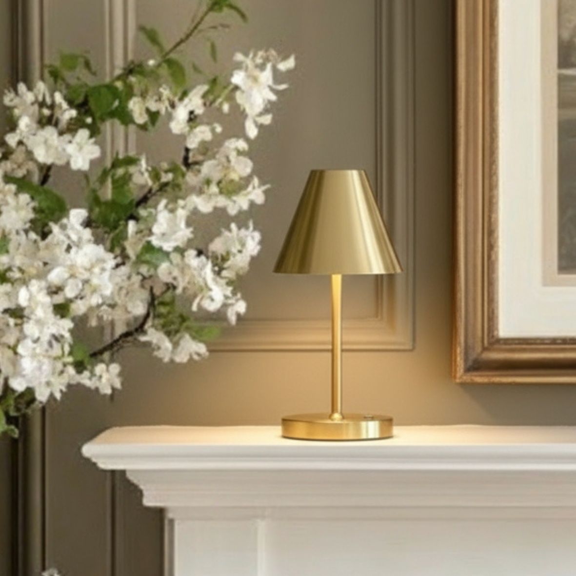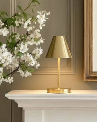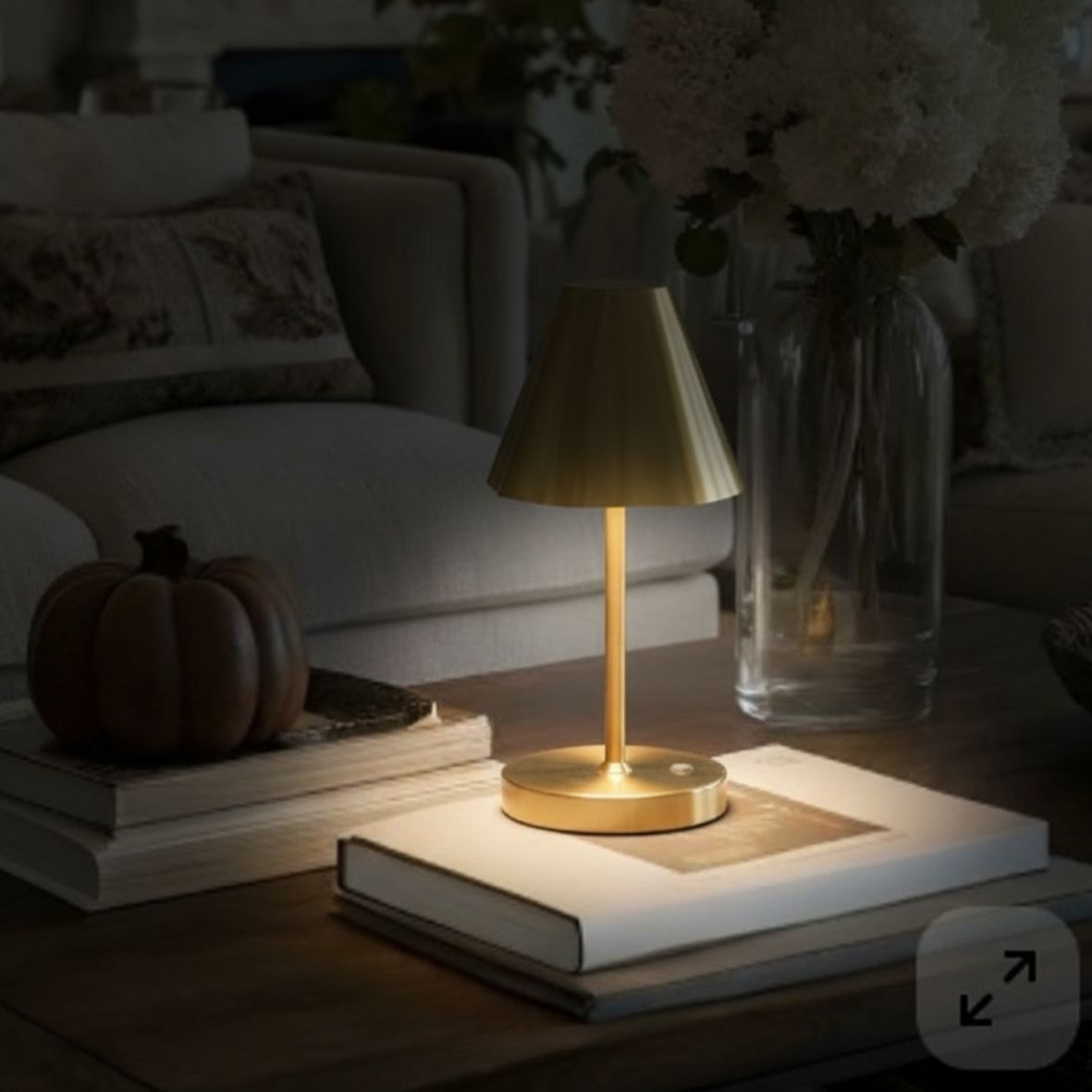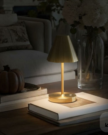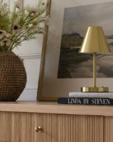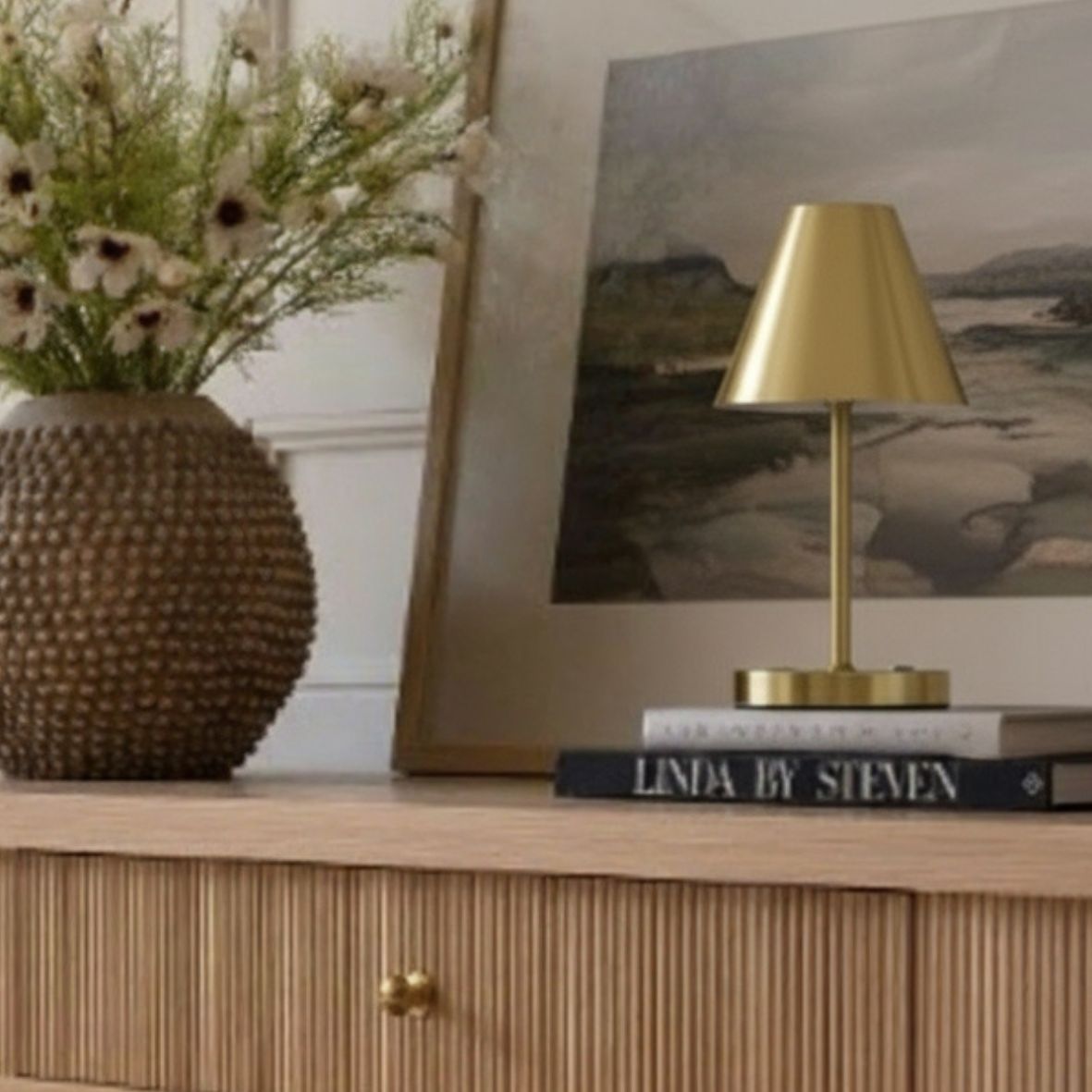 Meet your new favourite little glow. Our portable lamp combines function and beauty in one effortless piece. With its soft brass finish and gently wavy shade, it adds a touch of understated elegance wherever it goes — from your bedside table to your bookshelf or dining nook.