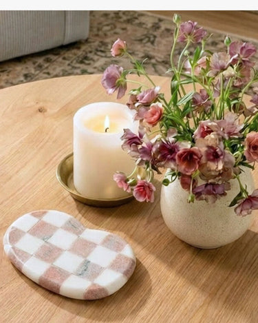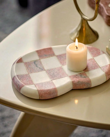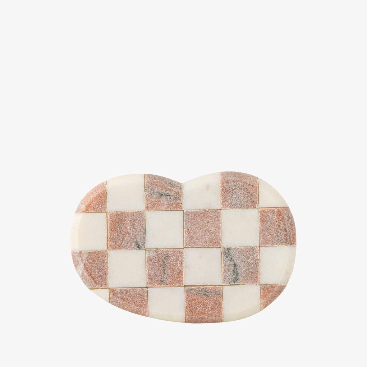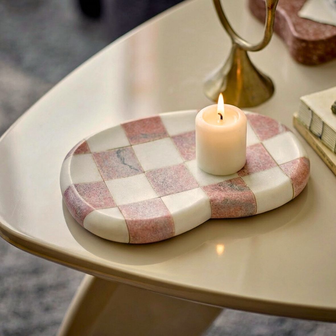 There’s something quietly romantic about the Primrose Tray. Crafted from polished marble with alternating rose and soft beige squares, it feels both timeless and fresh — like a vintage find that somehow fits perfectly into a modern home. The gentle curves along its edges soften the checkerboard pattern, while the delicate natural veining reminds you that no two pieces will ever be exactly alike. Each tray carries its own subtle story, shaped by the stone itself. L22xH2,5xW14,5 cm
