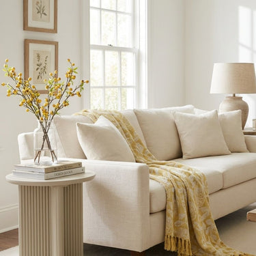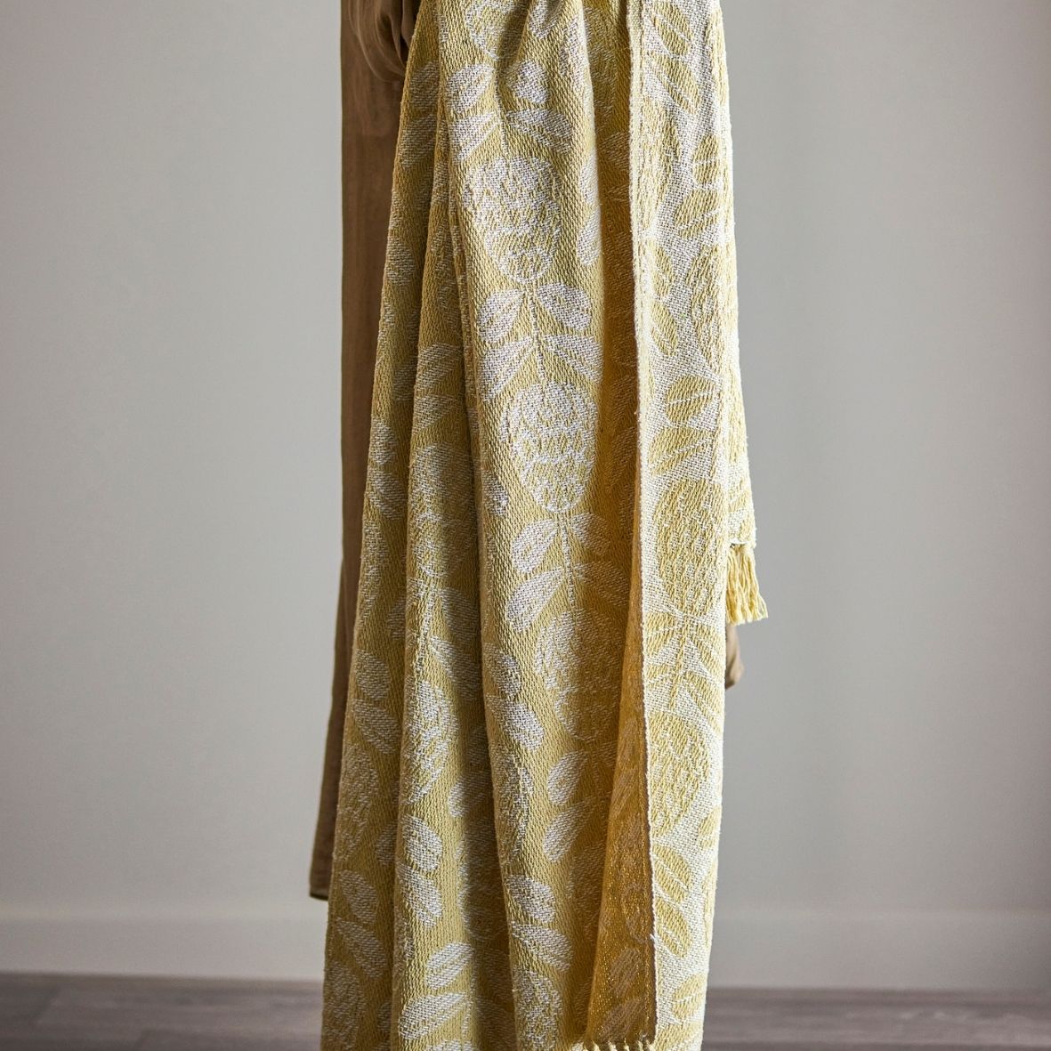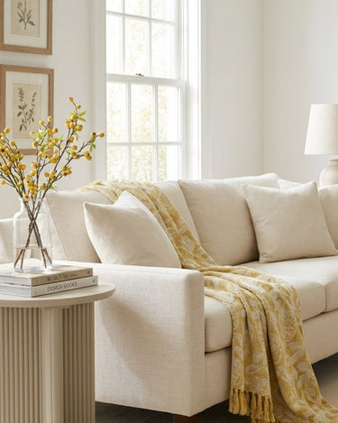 There’s something quietly uplifting about a piece that brings both warmth and lightness into a space, and our yellow and cream woven throw does exactly that. Crafted from soft woven cotton, it features a delicate, symmetrical leafy motif in a warm golden yellow set against a gentle cream background — the kind of palette that instantly softens a room and makes it feel lived in, loved, and effortlessly styled. L160xW130 cm