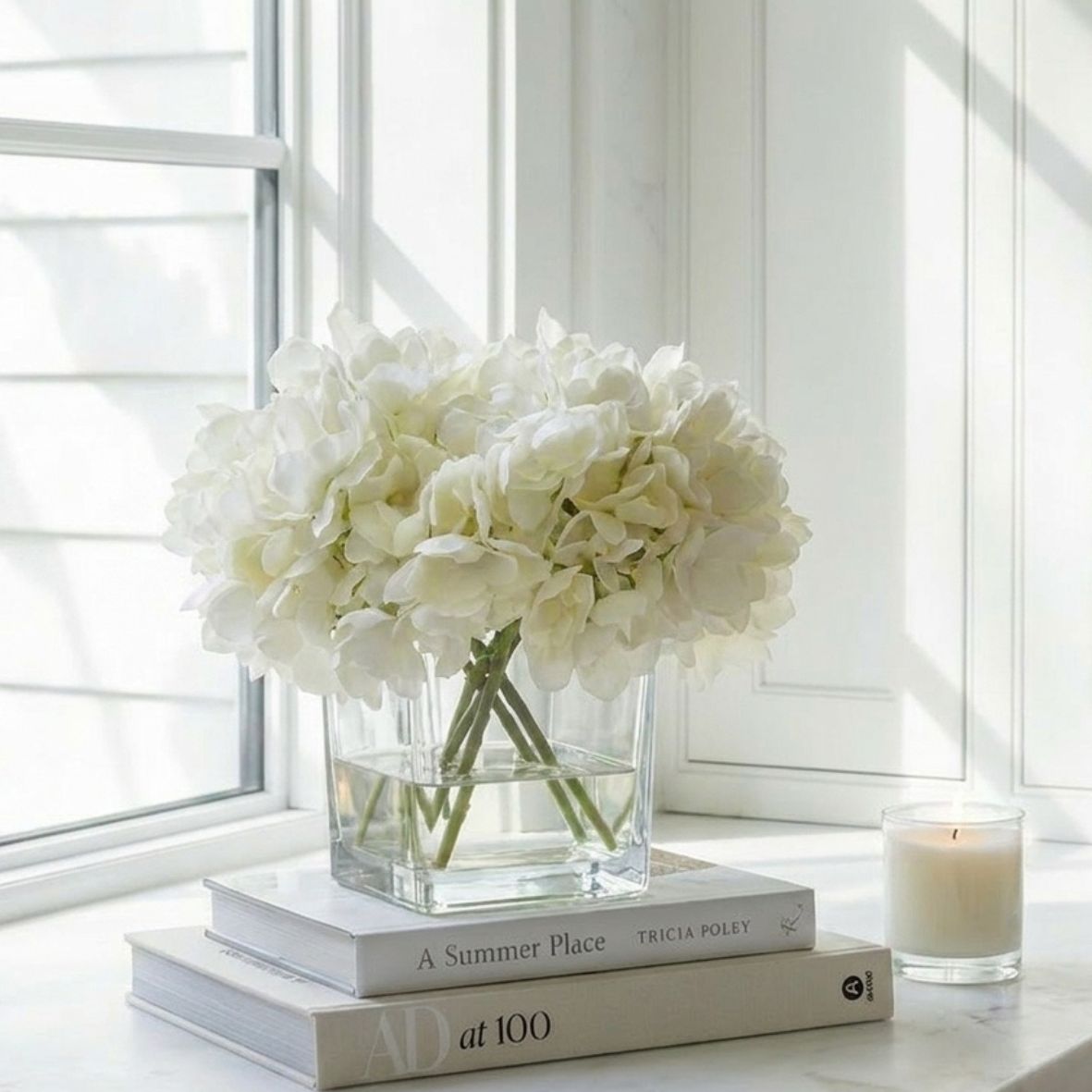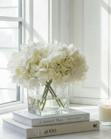 WHITE HYDRANGEA ARRANGEMENT IN CUBED GLASS VASE